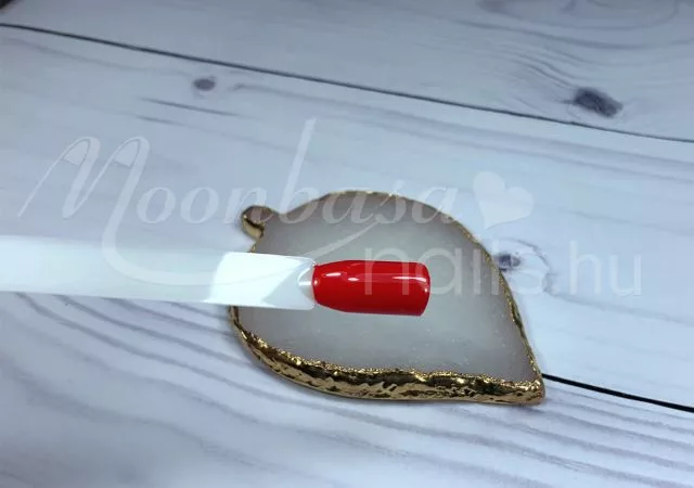A bonder megkötése után vigyük fel az első réteg 3step gel polishot, ügyelve arra, hogy ne legyen túl vastag. Ha túl sok anyagot használunk, előfordulhat hólyagosodás vagy csúszás a kötés során. A lakkozást határozott mozdulatokkal végezzük, ügyelve arra, hogy ne maradjon levegő a rétegek alatt. A világosabb árnyalatok – mint a fehér is – az első rétegben még áttetszőek lehetnek, a második réteg viszont tökéletes fedést biztosít.