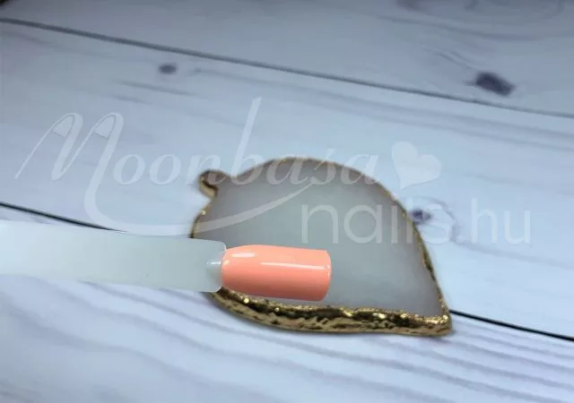 A bonder megkötése után vigyük fel az első réteg 3step gel polishot, ügyelve arra, hogy ne legyen túl vastag. Ha túl sok anyagot használunk, előfordulhat hólyagosodás vagy csúszás a kötés során. A lakkozást határozott mozdulatokkal végezzük, ügyelve arra, hogy ne maradjon levegő a rétegek alatt. A világosabb árnyalatok – mint a fehér is – az első rétegben még áttetszőek lehetnek, a második réteg viszont tökéletes fedést biztosít.
