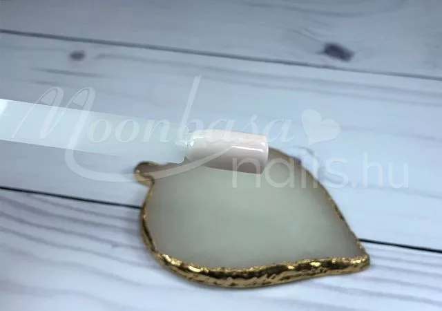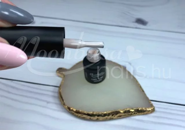 A bonder megkötése után vigyük fel az első réteg 3step gel polishot, ügyelve arra, hogy ne legyen túl vastag. Ha túl sok anyagot használunk, előfordulhat hólyagosodás vagy csúszás a kötés során. A lakkozást határozott mozdulatokkal végezzük, ügyelve arra, hogy ne maradjon levegő a rétegek alatt. A világosabb árnyalatok – mint a fehér is – az első rétegben még áttetszőek lehetnek, a második réteg viszont tökéletes fedést biztosít.