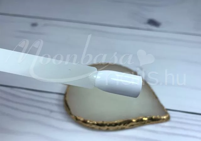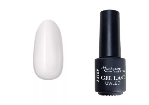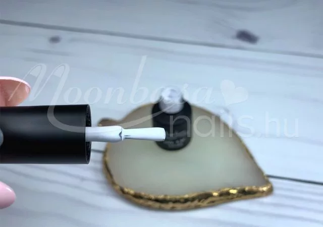 A bonder megkötése után vigyük fel az első réteg 3step gel polishot, ügyelve arra, hogy ne legyen túl vastag. Ha túl sok anyagot használunk, előfordulhat hólyagosodás vagy csúszás a kötés során. A lakkozást határozott mozdulatokkal végezzük, ügyelve arra, hogy ne maradjon levegő a rétegek alatt. A világosabb árnyalatok – mint a fehér is – az első rétegben még áttetszőek lehetnek, a második réteg viszont tökéletes fedést biztosít.