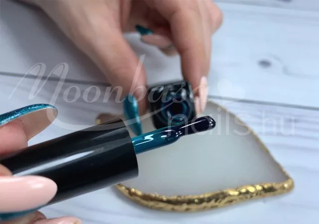 4. Jöhet az első réteg Amber glass géllakk. Csak a körömlemezre vidd fel, a bőröddel ne érintkezzen. Ha mégis, akkor kötés előtt narancsfa pálca segítségével korrigálhatod ezt a hibát.
