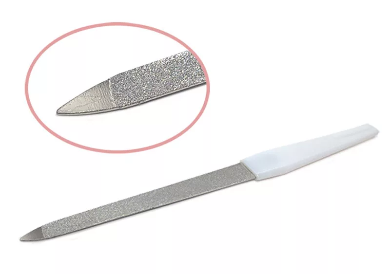 A Metal file with diamond powder 15 cm #2003 White kiemelkedően tartós, professzionális minőségű körömreszelő, amelyet műköröm-építéshez, manikűrhöz és pedikűrhöz egyaránt terveztek - szalonba és otthoni használatra egyaránt. Nem csúszik, és nem karmolja össze a körömfelszínt, így pontosan és hatékonyan végezheted el a formázást és az előkészítést.