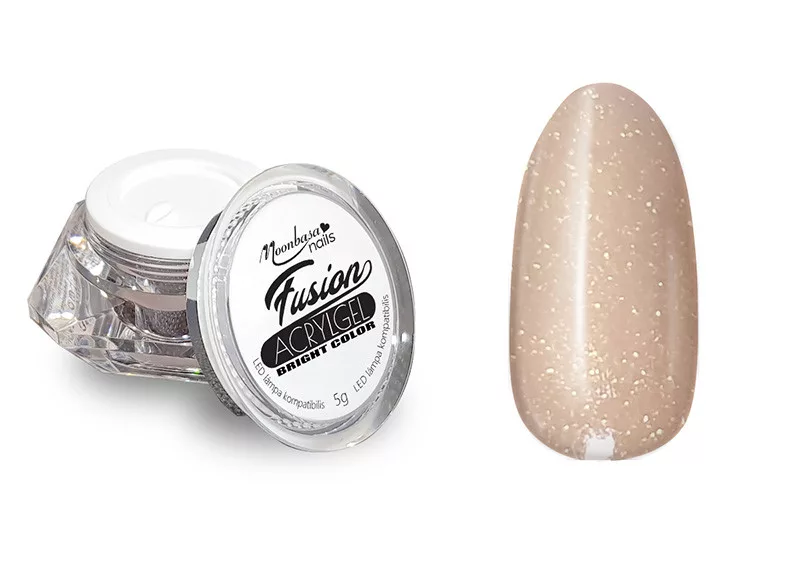 Moonbasanails Fusion Acrylgel Bright colour 5g #052 Glittery natural Hema-free is a professional PolyGel-type nail building material that combines the flexibility of gel nails with the stability of porcelain technique in one easy-to-use product. It is an ideal choice for nail bed extension, creating a strong base, and building natural-looking nails.