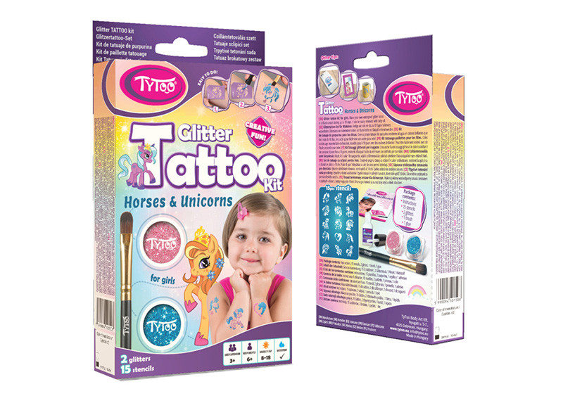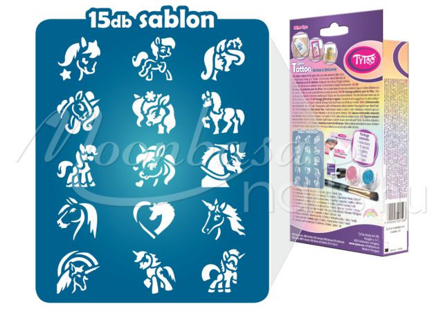 A szett tele van lovas, unikornisos és pónis sablonokkal, melyek kifejezetten gyermeked pici karjára lettek tervezve. Így akár saját magának is könnyedén elkészítheti az apró szikrázó tetkóit, de közösen szórakozva még jobb móka lehet számára!