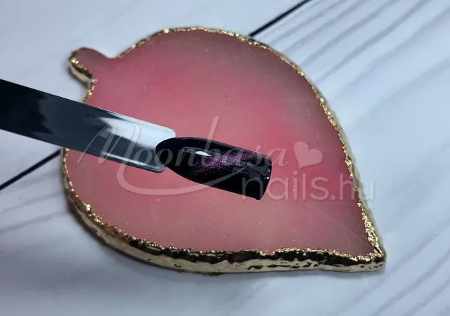 5. Még ne köttessük meg a felvitt réteget semmiképp se az UV/LED lámpánk fénye alatt! Most jön a varázslat ugyanis. Tiger eye szupererős mágnes segítségével varázsoljuk körömdíszítésünkbe a kívánt fényjátékot. Mivel már többféle mágnes is elérhető kínálatunkban és ezek használata is rendkívül sokoldalú, így ezek egyenkénti használatára itt most nem térnénk ki. A legfontosabb, hogy tartsd a mágnesedet a körömdíszítéshez olyan közel, amilyen közel csak tudod. Elegendő csak 1-2 másodpercre felmágnesezni a géllakkot, mert a minta azonnal ki fog rajzolódni.
