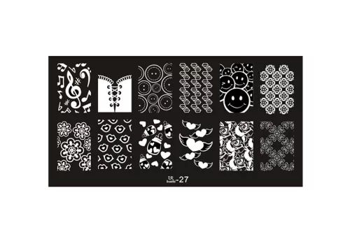 A Nail stamp plate 6x12cm UR-27  használatával nem kell többé szalonba menned, hogy különleges és szabályos mintákat kapj. A lemezeken található aprólékosan megmunkált minták – átlagosan 12 különböző minta, kb. 1,5 x 2,5 cm méretben – tökéletesen illeszkednek bármilyen körömformához: rövid, hosszú, mandula, stiletto vagy szalonkocka.