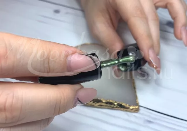 A mágnes segítségével a csillámló arany szemeket egy sávba tudod vonzani, amely ezt a különleges tigrisszem hatást fogja kelteni. A Tigrisszem lakkzselé két rétegben tökéletesen fed. Az első réteget UV/LED lámpa fénye alatt köttesd meg. A második rétegen alkalmazd a mágnest megkötés előtt.