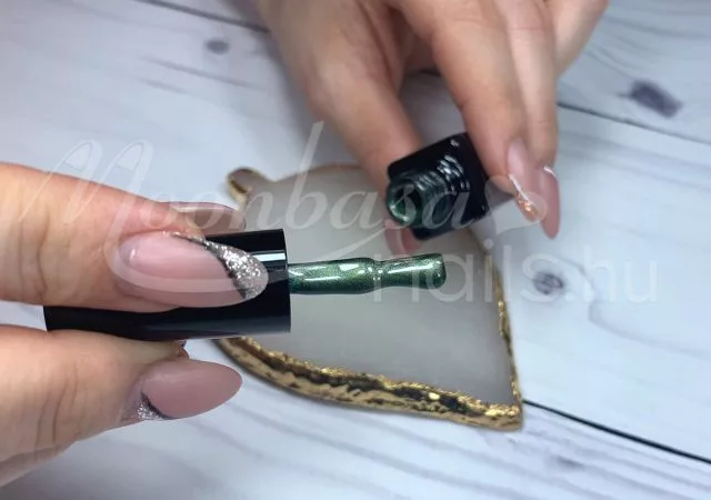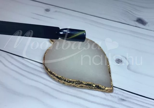 A mágnes segítségével a csillámló arany szemeket egy sávba tudod vonzani, amely ezt a különleges tigrisszem hatást fogja kelteni. A Tigrisszem lakkzselé két rétegben tökéletesen fed. Az első réteget UV/LED lámpa fénye alatt köttesd meg. A második rétegen alkalmazd a mágnest megkötés előtt.