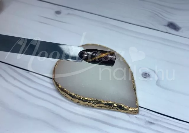 A mágnes segítségével a csillámló arany szemeket egy sávba tudod vonzani, amely ezt a különleges tigrisszem hatást fogja kelteni. A Tigrisszem lakkzselé két rétegben tökéletesen fed. Az első réteget UV/LED lámpa fénye alatt köttesd meg. A második rétegen alkalmazd a mágnest megkötés előtt.