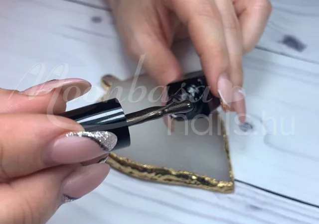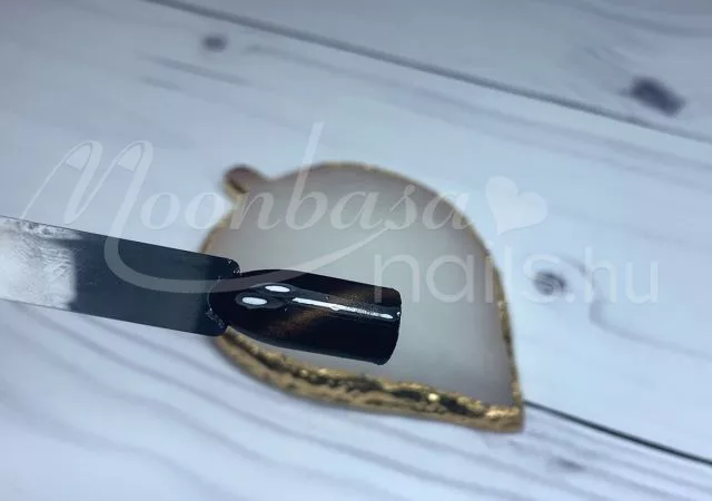 A mágnes segítségével a csillámló arany szemeket egy sávba tudod vonzani, amely ezt a különleges tigrisszem hatást fogja kelteni. A Tigrisszem lakkzselé két rétegben tökéletesen fed. Az első réteget UV/LED lámpa fénye alatt köttesd meg. A második rétegen alkalmazd a mágnest megkötés előtt.