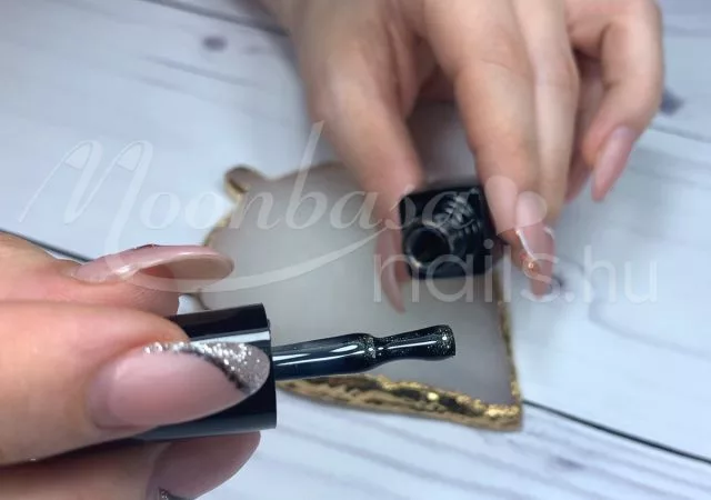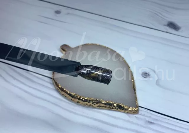 A mágnes segítségével a csillámló arany szemeket egy sávba tudod vonzani, amely ezt a különleges tigrisszem hatást fogja kelteni. A Tigrisszem lakkzselé két rétegben tökéletesen fed. Az első réteget UV/LED lámpa fénye alatt köttesd meg. A második rétegen alkalmazd a mágnest megkötés előtt.